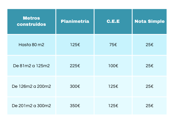 El servicio complementario y adicional de la realización y entrega de Planimetría así como la realización del certificado de eficiencia energética tendrá un precio que irá en función de las dimensiones del inmueble que a continuación detallamos: